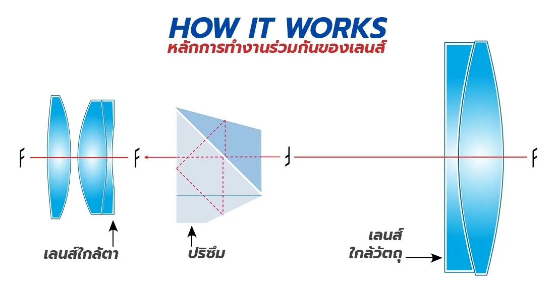 3. เลนส์ใกล้ตา : ขยายภาพ โดยรับแสงจากปริซึม และขยายภาพนั้น ก่อนส่งเข้าสู่ดวงตาของเรา