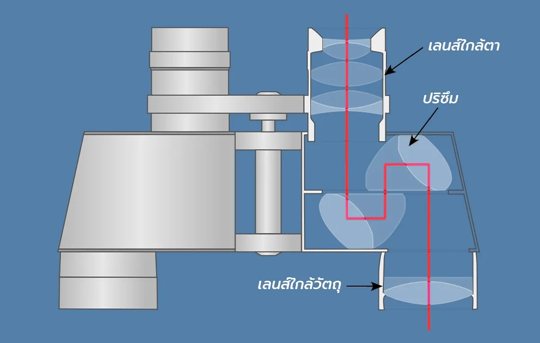 2. ปริซึม : ตัวกลางส่งต่อภาพ โดยรับแสงจากเลนส์ใกล้วัตถุ และสะท้อนแสงนั้น เพื่อ