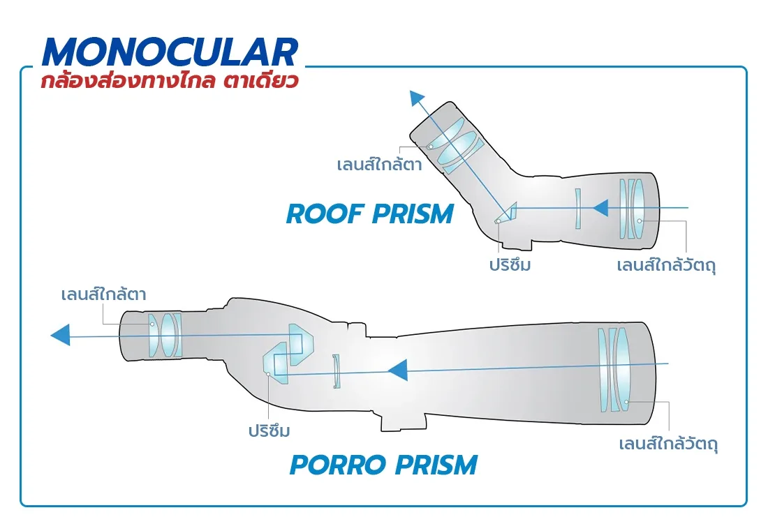 - ข้อดี : ให้ภาพที่สว่าง มุมมองภาพกว้าง และการออกแบบที่ไม่ซับซ้อน ทำให้มีราคาถูกกว่า Roof Prism