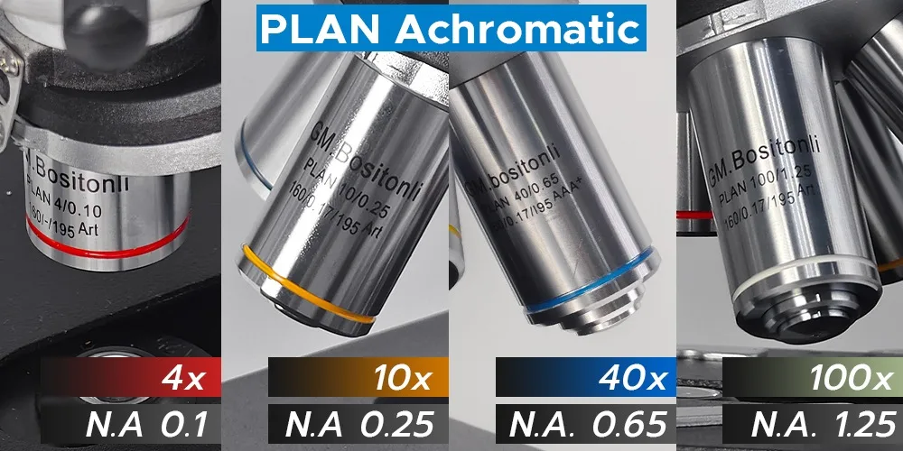 - อาจเลือกเลนส์ชนิด Achromatic แทนได้ ถึงแม้ผลลัพธ์จะด้อยกว่า Plan Achromatic ในเรื่องของความคมชัดที่ขอบของภาพ แต่ก็เพียงพอสำหรับการใช้งานทั่วไปในห้องปฏิบัติการ และการเรียนการสอนที่เน้นการสังเกตโครงสร้างพื้นฐาน