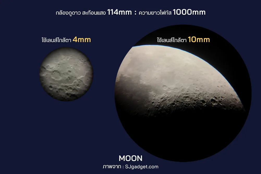 - เช่น กล้องดูดาวที่มีความยาวโฟกัส 1000 mm หากใช้ร่วมกับเลนส์ใกล้ตา 4 mm จะได้กำลังขยาย 250 เท่า หรือ ใช้ร่วมกับเลนส์ใกล้ตา 10 mm + Barlow Lens 2x ก็จะได้กำลังขยายที่ 200 เท่า ถึงแม้ว่ากำลังขยายจะน้อยกว่า แต่ได้ประสบการณ์การส่องดาวที่ดีกว่าแน่นอน หรือ หากเป็นการส่องดวงจันทร์ แค่ใช้เลนส์ใกล้ตา 10 mm ได้กำลังขยาย 100 เท่า ก็เพียงพอแล้ว