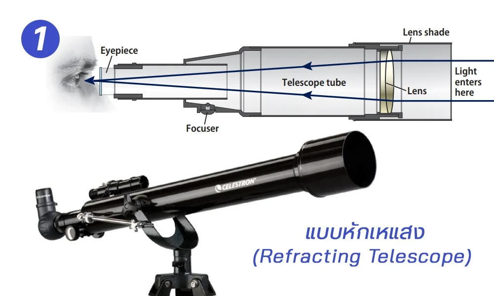 - กล้องโทรทรรศน์แบบหักเหแสง (Refracting Telescope) : ใช้เลนส์นูนที่หน้ากล้องในการวมแสง ก่อนส่งไปยังเลนส์ใกล้ตา